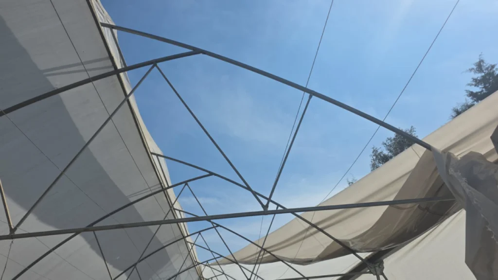 - Estructura y accesorios: Perfiles metálicos, tornillería de acero inoxidable, grapas, alambre tensor y cinchas para la estructura lateral frente al viento.